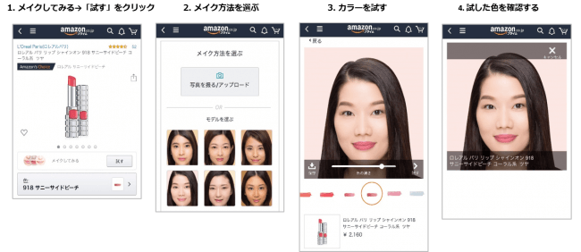 Amazonが導入する新機能「バーチャルメイク」は、モディフェイスが提供するAIを活用して、自動的に製品の色などを瞬時に分析して読み取り、その情報をもとに、ARによって実際にメイクしたような仕上がりを画面上の顔に投影して、再現することができるというもの。