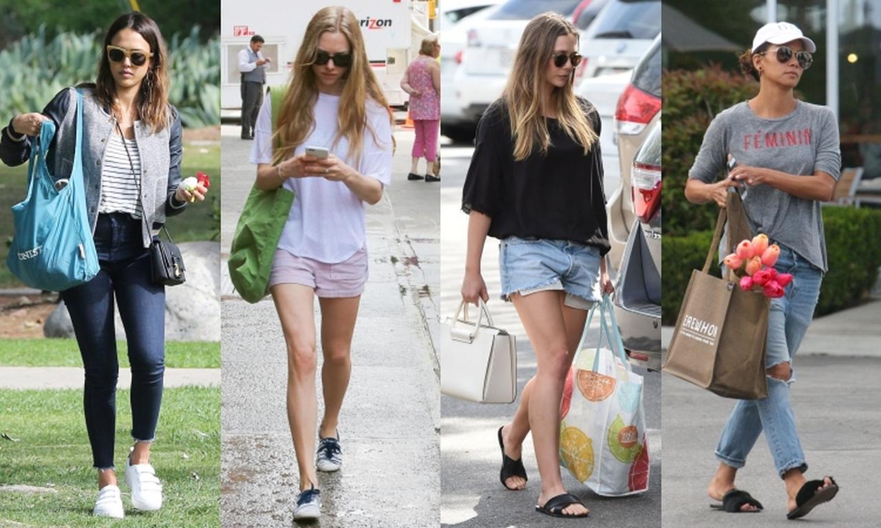 エコバッグを使うセレブたち(左から):女優のジェシカ・アルバ、アマンダ・サイフリッド、エリザベス・オルセン、ハル・ベリー