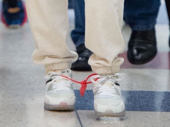 オフホワイト × ナイキのコラボスニーカーを、スウェットパンツの白とつなげて見せ、スタイル良く見せるテクを使って。オフホワイトを象徴する赤タグが白コーデのなかで主張して。