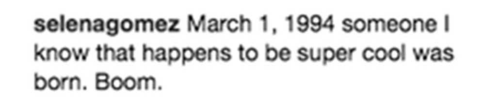 セレーナが消したのは、昨年3月、同月の1日に誕生日を迎えたジャスティンらしき人物が写ったポラロイド写真をおでこにくっつけ、楽しそうに笑う自分の写真に、「1994年の3月1日、私の知っている超クールな誰かさんが誕生しました。Boom(ブーム)(※)」というコメントを添えて投稿したもの。