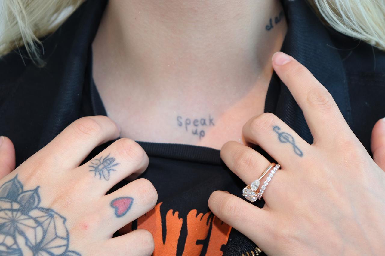 「私は誰かと対立するのが苦手なタイプだから、ボーイフレンドや誰かと口論になったときは、何も言えずにただ座り込んでしまうときがあるの。なにを言えばいいのかわからなくて。頭のなかでは言いたいことがはっきりわかっているはずなのに、怖くて声に出せないの。意見がないタイプではないし、歌詞にはなんでも書けるのにね。なにかが私の存在を小さくしてしまう。本当の自分はこんな風じゃない、って思ってこのタトゥーを選んだ。『はっきり言いなさい、あなたには発言する権利がある』っていうリマインダーみたいなもの」