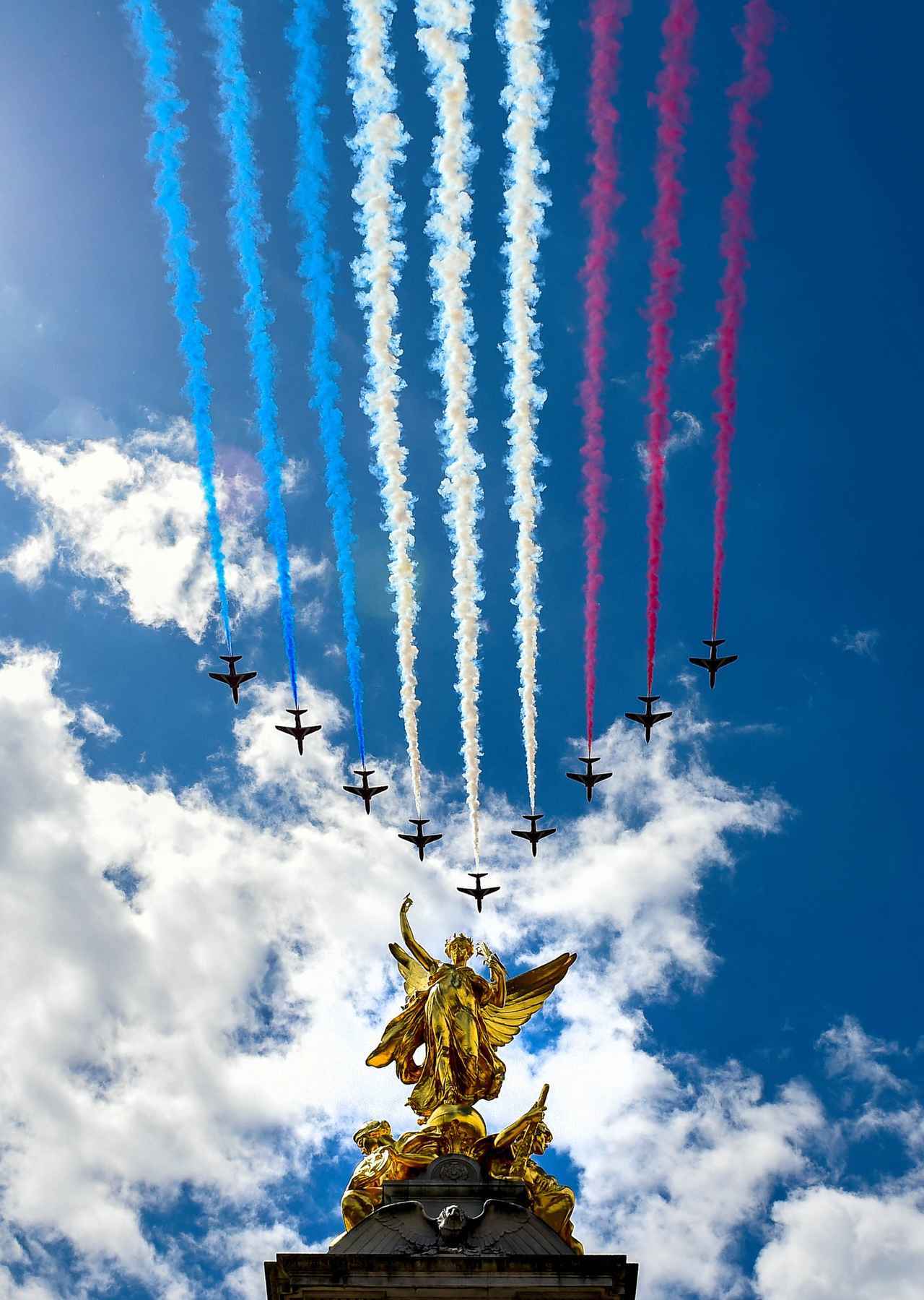 毎年行なわれるイギリス空軍による空中分列飛行は、式典の目玉のひとつ。ウィリアム王子とキャサリン妃の子供たちである、ジョージ王子、シャーロット王女、そして1歳になったばかりのルイ王子さえも、大きく手を広げて、飛行機が作るダイナミックな空の模様を楽しんだ。