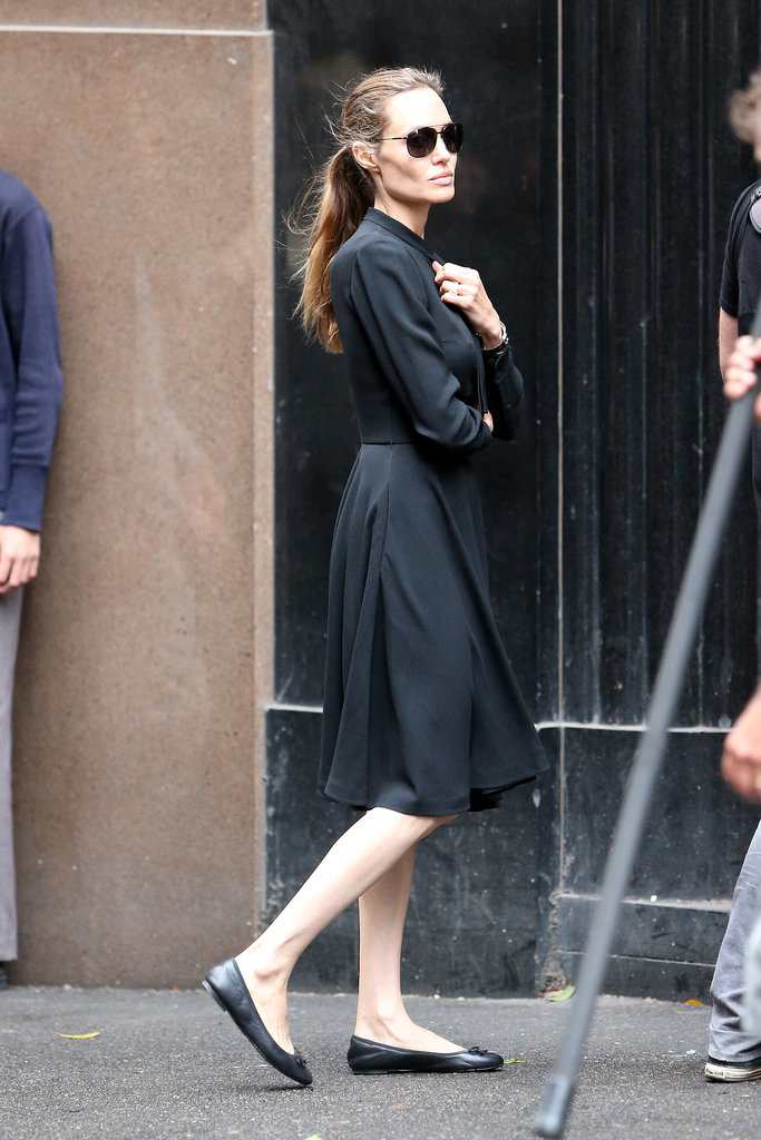 シンプルな黒のワンピースに、バレエシューズを合せた世界的女優のアンジェリーナ・ジョリー。フレアスカートと好相性な丸みを帯びたフォルムのバレリーナシューズは、エレガントながらも、装いにきちんと感もプラスしてくれ、脚への負担もかかりにくく履き心地もばつぐん。