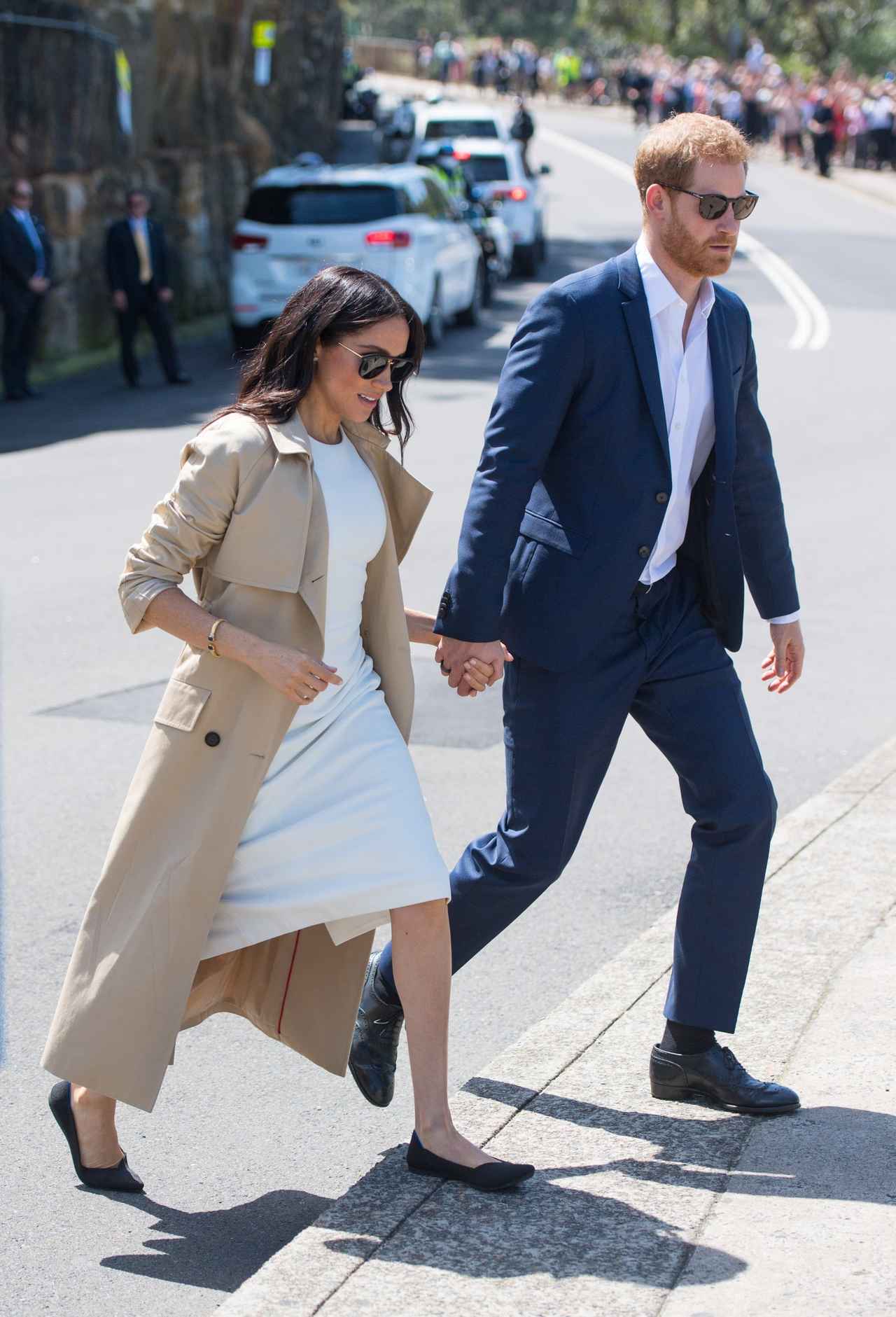 シンプルながらも洗練されたスタイルが世界中で注目を集めるメーガン妃は、シンプルな白のタイトワンピースに、ブラックのポインテッドトゥのフラットシューズを合せたルックで公務をこなして。