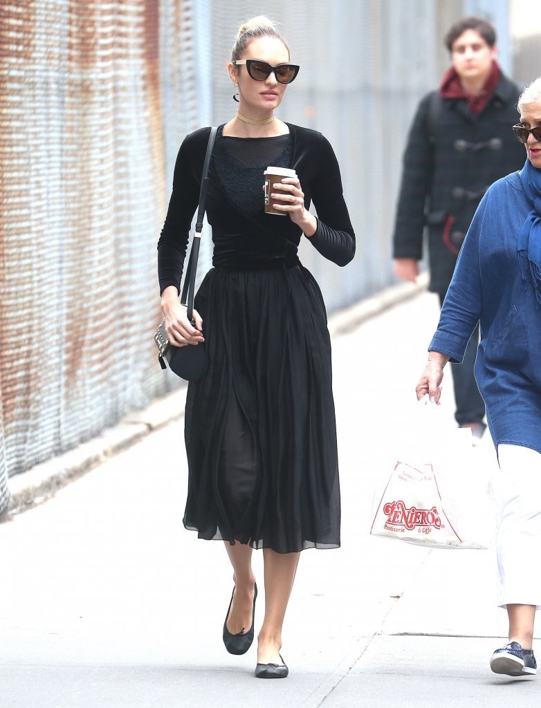 トップブランドからオファーが絶えないトップモデルのキャンディス・スワンポールは、シックな全身ブラックコーデにバレエシューズを合せた洗練ルックで打ち合わせに向かって。