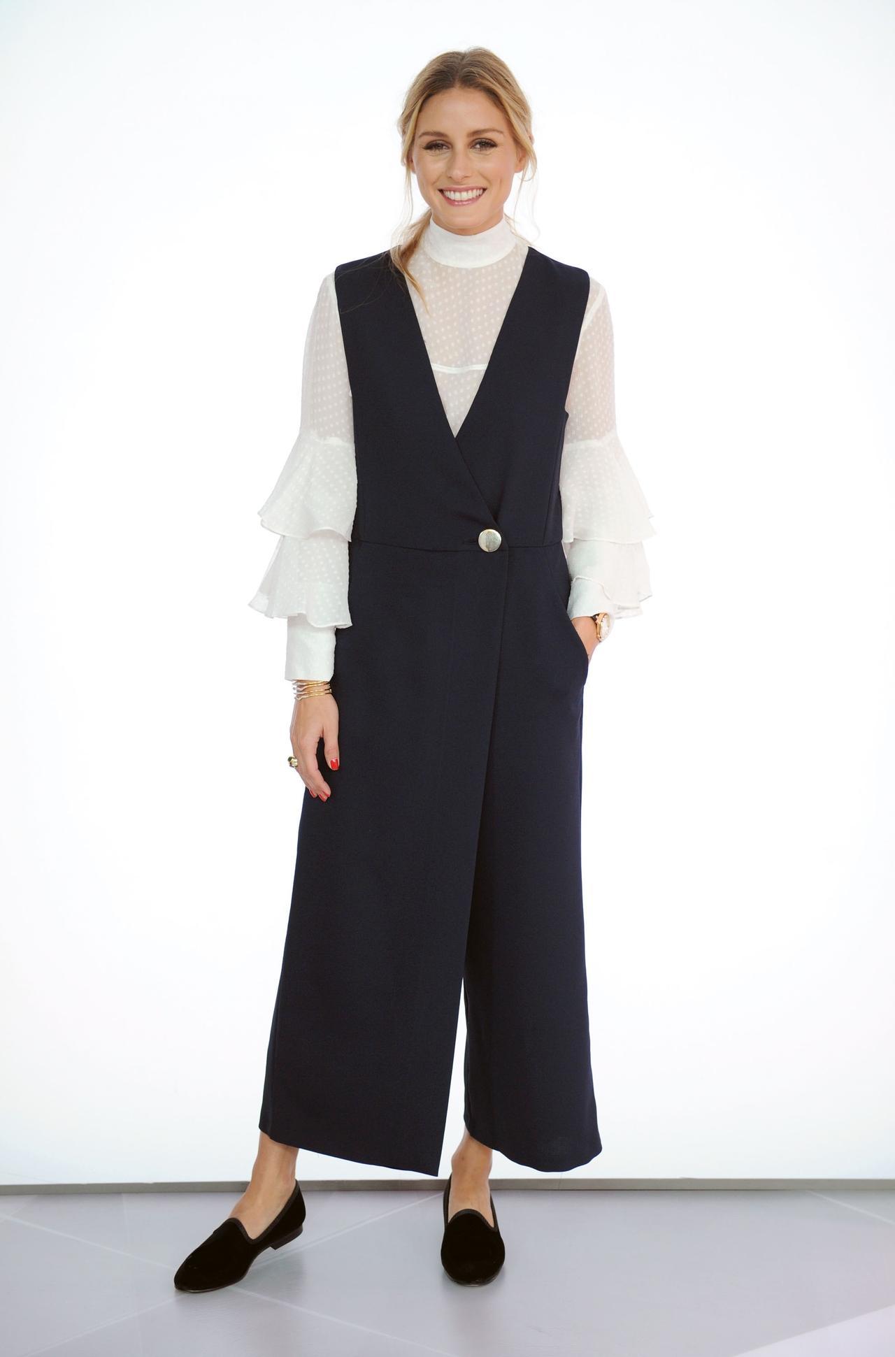 フリルのガーリーなブラウスにサロペットを合わせたレイヤードスタイルでイベントに出席した、人気ファッショニスタのオリビア・パレルモ。足元には、メンズライクなフラットシューズでアクセントを効かせた、スタイリッシュな甘辛コーデを披露して。