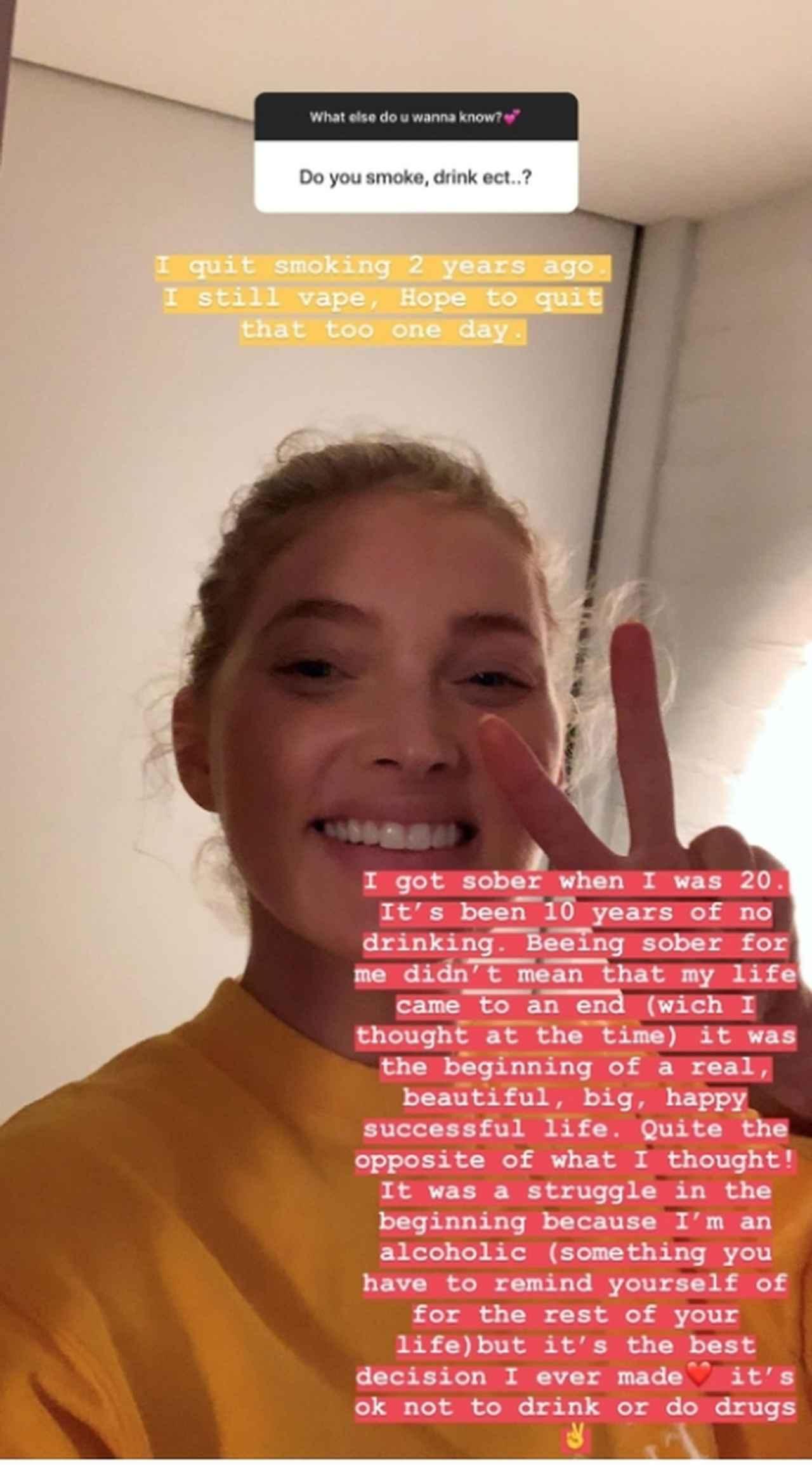 「20歳のときにシラフになろうと決めたの。シラフになることは、私の人生が終わってしまうような絶望的なことではなかった(なる前はそう思ってたけど)。お酒を飲まないでいることは、私の本当の、美しくて、ビッグで、ハッピーで、成功と呼べる人生の始まりだった。私が想像していたのと真逆なことだったの!私はアルコール依存症だから(これは残りの人生で一緒に歩んでいかないといけない事実よね)最初は辛かったけど、今までで1番の選択だったって言える。お酒に頼らなくたって、ドラッグに頼らなくたって大丈夫」