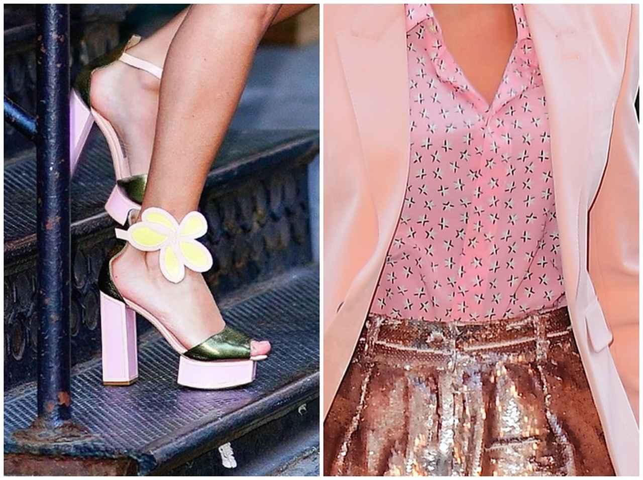 スターがプリントされたシャツと、スパンコールを施したショーツを合わせたポップなピンクコーデの足元には、イエローのフラワーがアンクルストラップに飾られた、ロマンティックなプラットフォームのサンダルをチョイス。