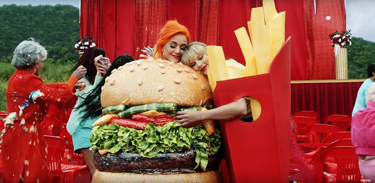 そんなMVには、テイラーと犬猿の仲だったケイティ・ペリーも出演しており、相性抜群のハンバーガーとフライドポテトの着ぐるみでハグして、2人が完全に和解したことを表現。