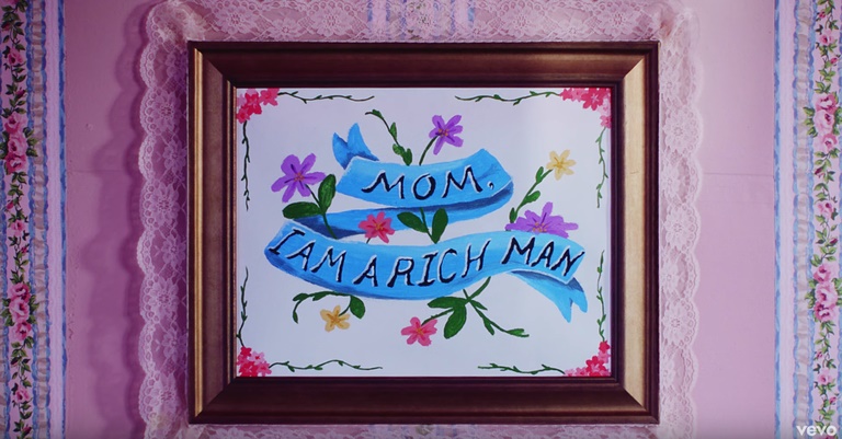 映画『キューティ・ブロンド』をオマージュしたヴィヴィッドピンクの衣装が印象的なシーンで身に着けているサングラスには13個のラインストーンが。また、カラフルなウィッグをつけたシーンでは、13と書かれたネックレスを着用。