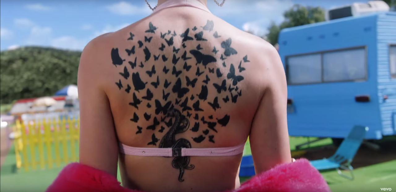 楽曲「ルック・ホワット・ユー・メイド・ミー・ドゥ」やアルバム『レピュテーション』に登場した蛇がテイラーの闇を表し、「ME!」で描写された蝶をテイラーの光を表す。テイラーの背中にある蛇(闇)が蝶(光)の大群に覆われたタトゥーで、愛がヘイトに勝ることを表現した。