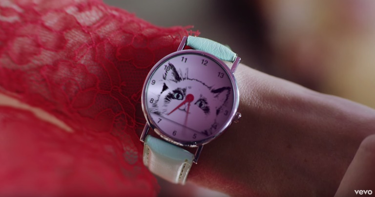 前作「ME!」のMVで新たに迎えたテイラーの愛猫ベンジャミン・バトンのイラストが描かれた腕時計には、言わずと知れたラッキーナンバーの13が。