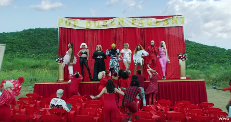 左から、アリアナ・グランデ、レディー・ガガ、アデル、カーディ・B、テイラー・スウィフト、ビヨンセ、ケイティ・ペリー、ニッキー・ミナージュに扮したドラァグクイーンコンテストが開催。 ドラァグクイーンを主人公にしてLGBTQ+界の啓もう活動に大きな役割を果たしていると絶賛されるリアリティ番組『ル・ポールのドラァグ・レース』をオマージュしたシーンには、ル・ポールが審査員として登場。