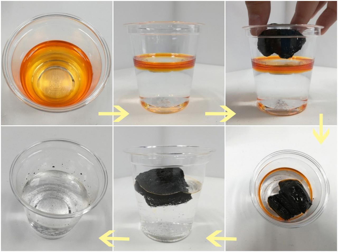 ちなみに赤松炭をラー油が浮かんだコップの水に浸してみると…