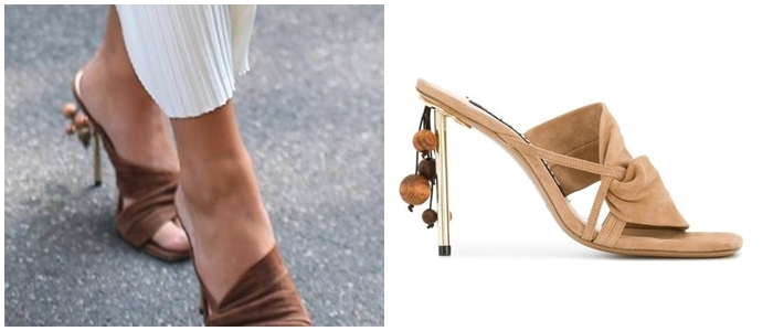 まるでアクセサリーで飾られたような、Jacquemus(ジャックムス)のデザインヒールは、スエードレザーのアッパーに、ゴールドのヒールがセットされ、ヒール部分にはウッドボールが重ねられたファッショナブルなアイテム。