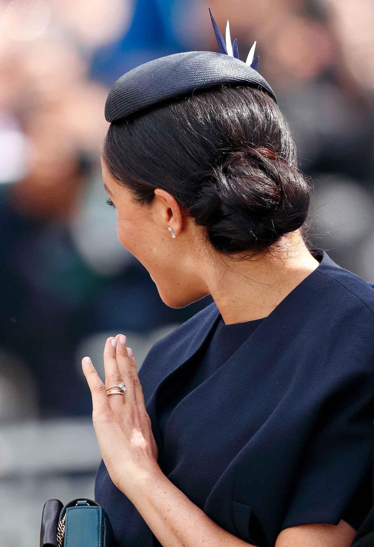 先日、エリザベス女王の誕生日を祝うパレード「トゥルーピング・ザ・カラー」で、長男アーチーの誕生後初めてロイヤルファミリーの恒例行事に復帰したメーガン妃。この時、以前から肌身離さず身に着けている婚約指輪&結婚指輪のほかに、出産祝いとして贈られたと思われる“第3の指輪”が追加されていたことが話題になったが、じつはこの時点ですでに婚約指輪にも変化が。