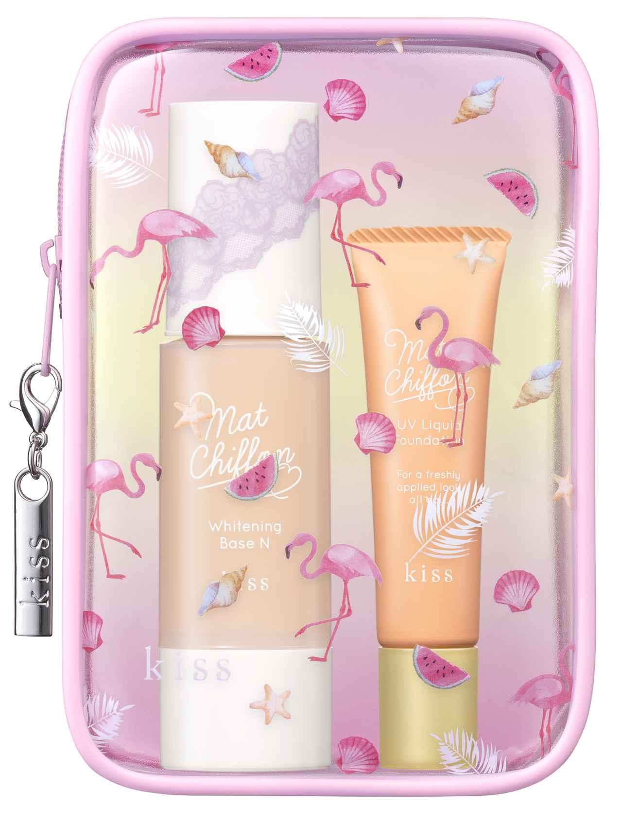 大人気、キスのマットシフォンシリーズから、クチコミでも絶大な支持を集めるさらさら薬用美白※1 ベースに厚塗り感のない軽いつけ心地の耐久リキッドファンデのミニサンプルが付いたセットが、夏にぴったりの限定オリジナルクリアポーチに入って数量限定発売。
