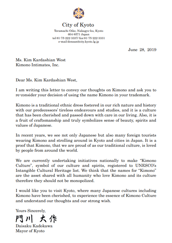 そこには、これまで日本人がいかに着物を大切にしてきたかということや、「KIMONO」「きもの」「着物」の名称は着物や着物文化を愛する全ての人たちの共有財産であることなどが書かれており、新しい下着ブランド名として使用するのは考え直して欲しいという気持ちが綴られていた。さらに京都市長は、キムに京都に来てもらい「着物文化」の神髄に触れて欲しいというメッセージも送った。