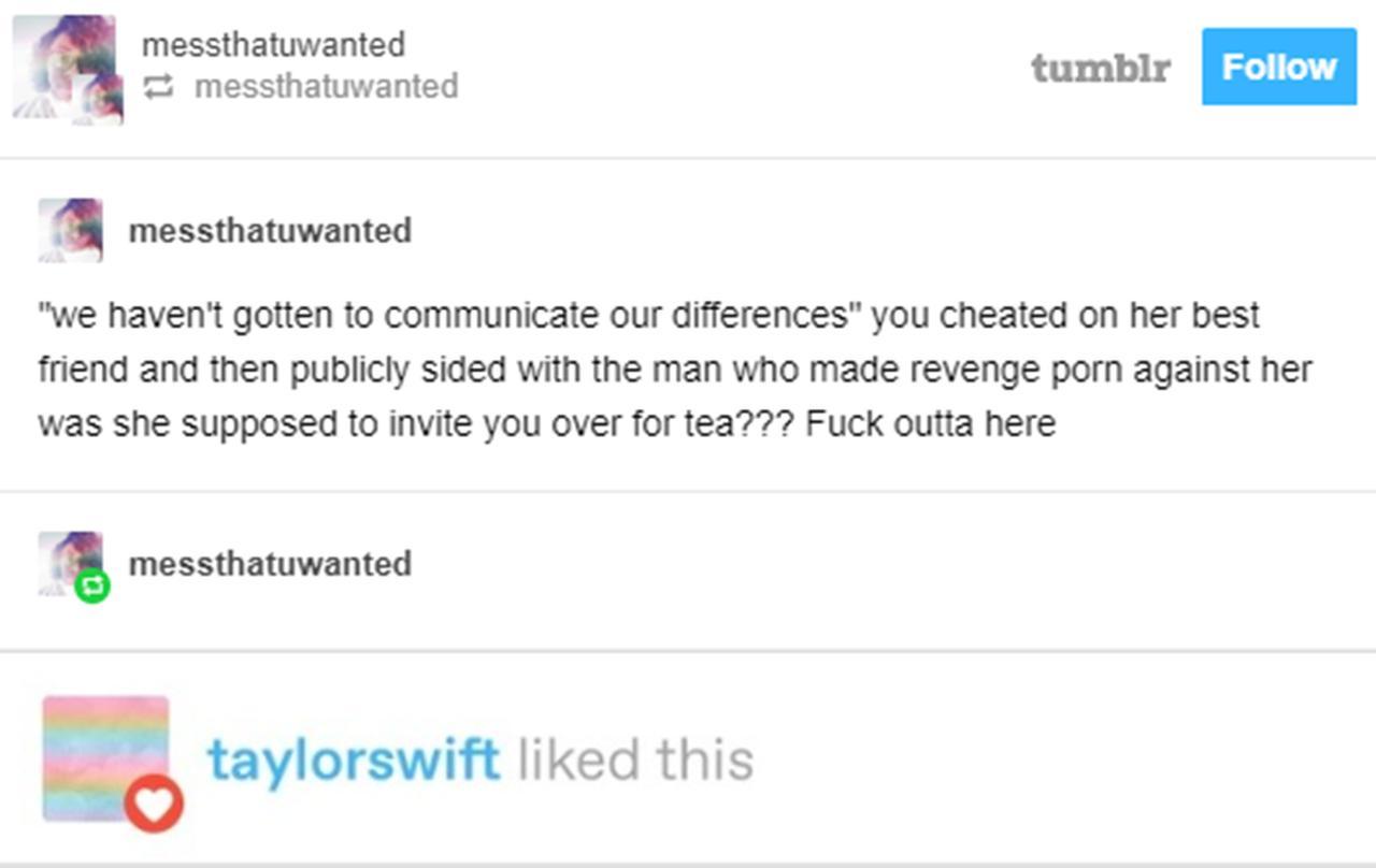 事の発端となったのは、テイラーがソーシャルブログのTumbr(タンブラー)で「いいね」をしたあるファンのコメント。