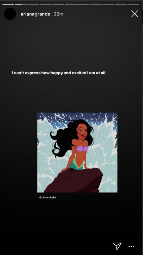 ハリーのキャスティングの知らせに、アリアナ・グランデはインスタグラムを更新。「私がどれだけハッピーでワクワクしているのか、表すことなんてできない」とハリーが投稿したアリエルのイラストをリポストして反応。