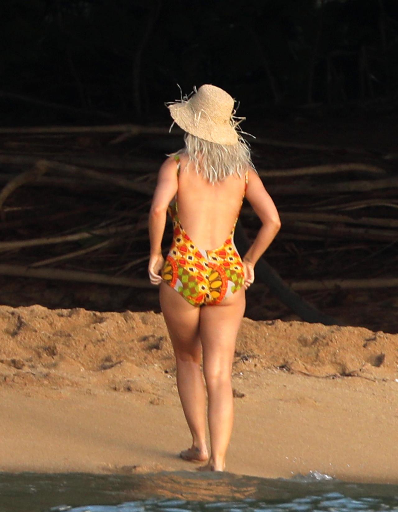 その後衣装チェンジをしたケイティは、今度はストローハットに合わせた絵画調の柄水着を着用。背中が大胆に大きく開いているUバックスタイルの水着で、ケイティらしい大人の派手スタイルを完成させた。