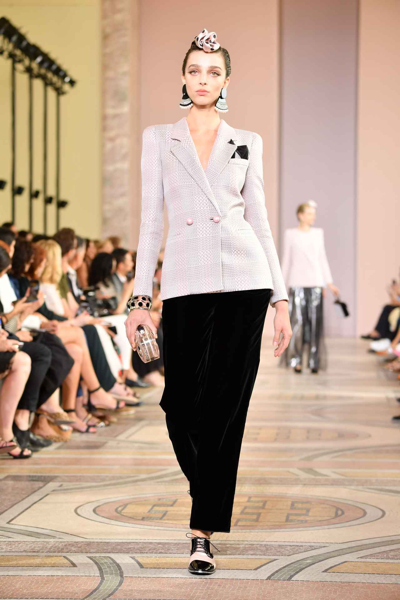 ジョルジオ・アルマーニによるオートクチュールラインであるアルマーニ・プリヴェのコレクションで、髪の毛につけるシュシュが少し変わった方法で使われていた。(フロントロウ編集部)