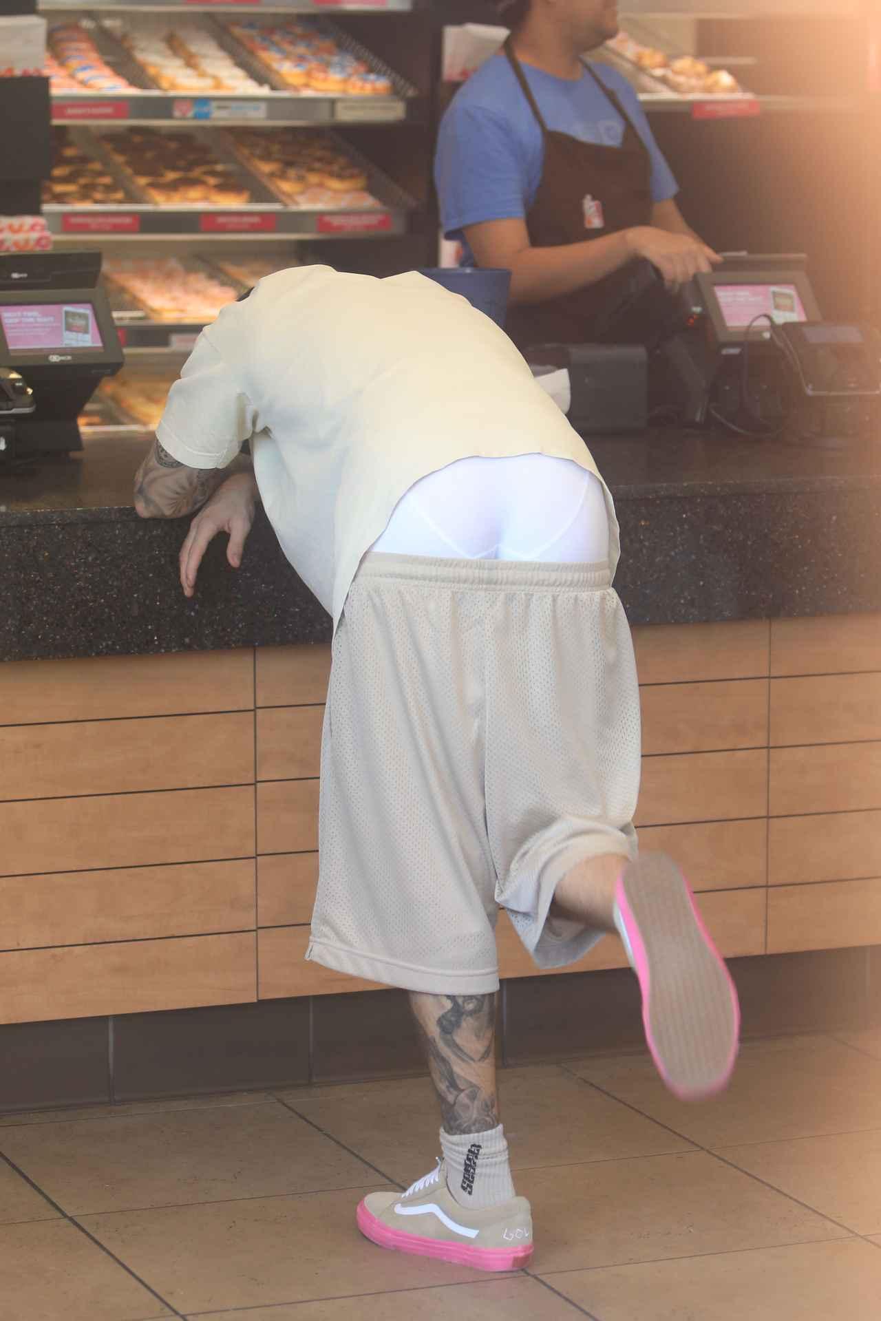 人気ドーナツチェーン店「ダンキン(Dunkin’)」で注文をするシンガーのジャスティン・ビーバーの「お尻」が、まさかの“こんにちは”!?(フロントロウ編集部)