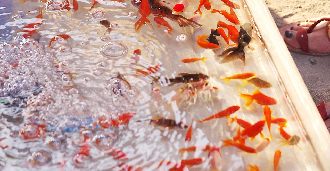 赤色の金魚に混ざって、レアな黒色の金魚も。より楽しげな雰囲気に。