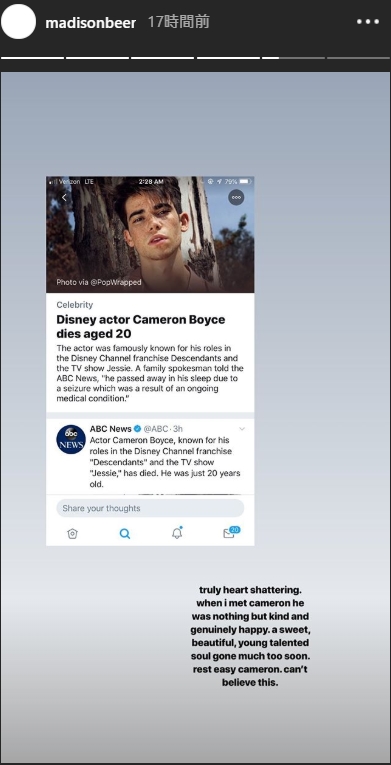 「胸が張り裂けそうな思いです。私がキャメロンに会ったとき、彼はとても優しく、内なる幸せがあふれる人以外の何者でもありませんでした。思いやりがあって、美しく、若く、才能をもつ魂を失いました。安らかに眠ってください。信じられません」