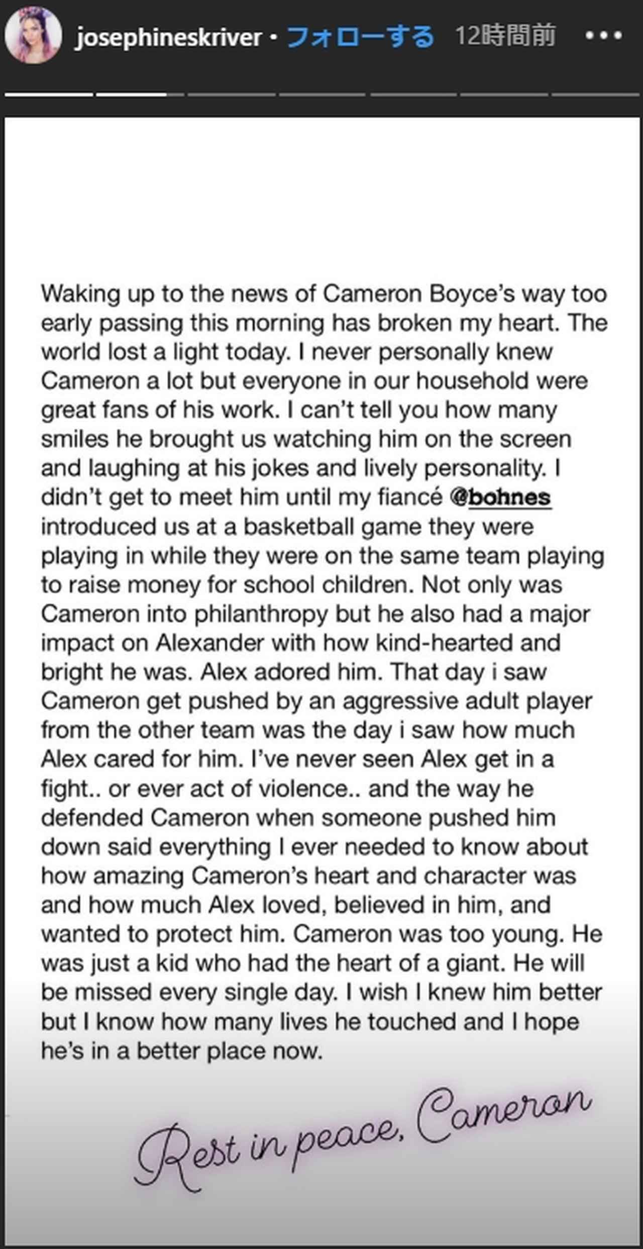 「キャメロン・ボイス、安らかに眠ってください。才能に溢れた魂でした。君の家族に愛を送ります」
