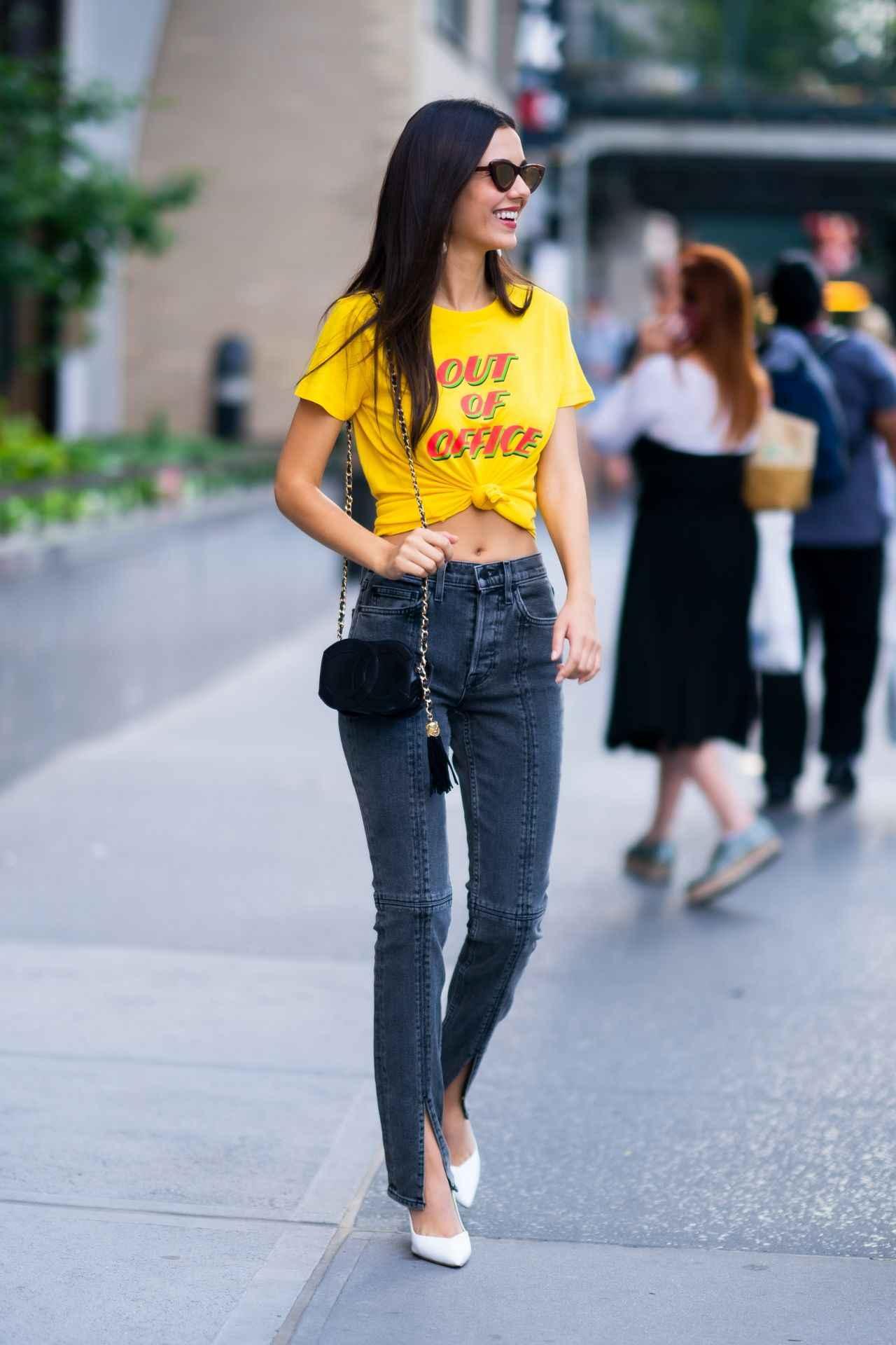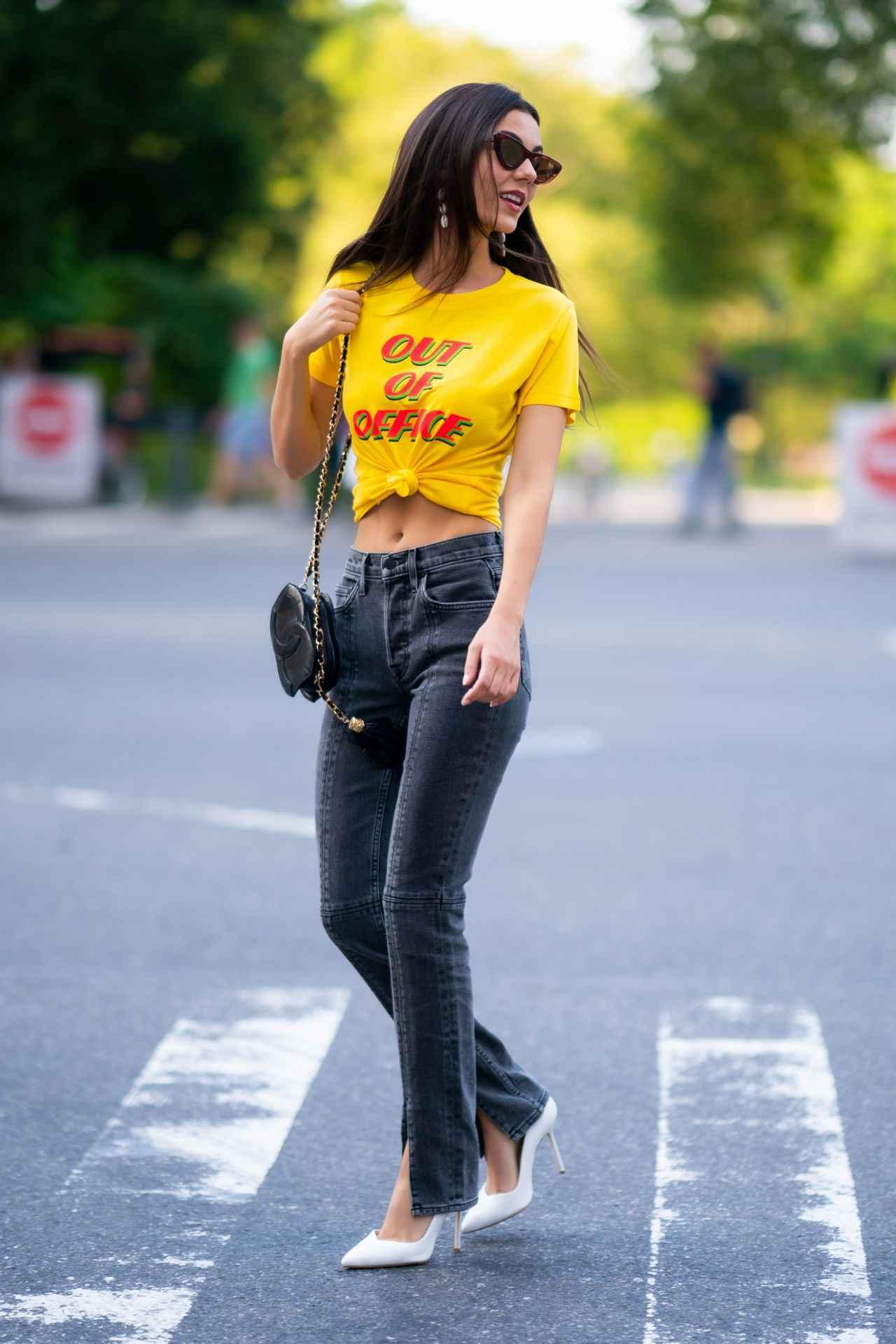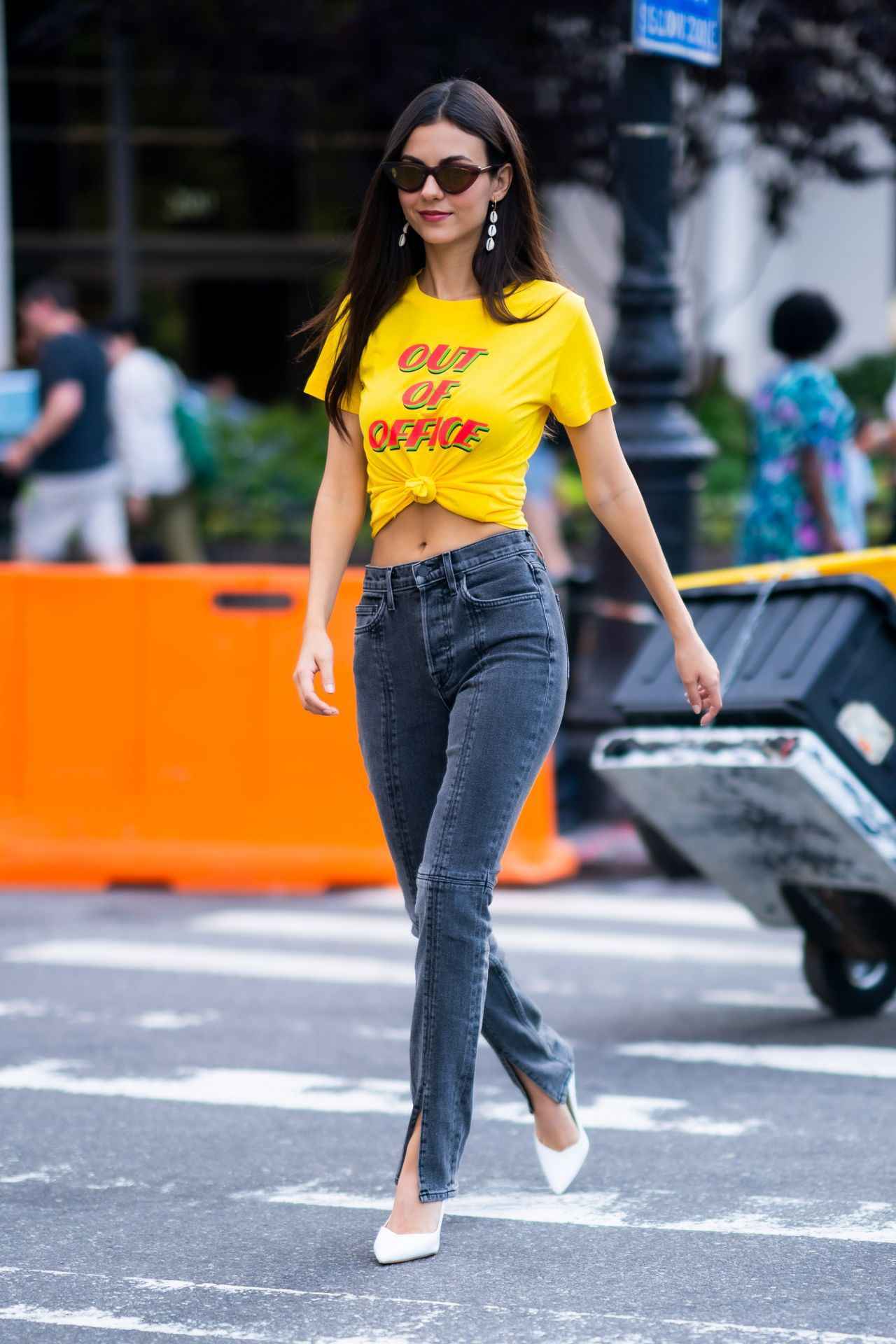 「OUT OF OFFICE(オフィスにはいません)」とプリントされたキャッチ―なメッセージTシャツの裾をキュッと結んでこなれた着こなしを披露した、人気女優のヴィクトリア・ジャスティス。ボトムには、今季注目の裾が裂けたデザインの「スプリットレグ・デニム」を合わせた旬なスタイル。