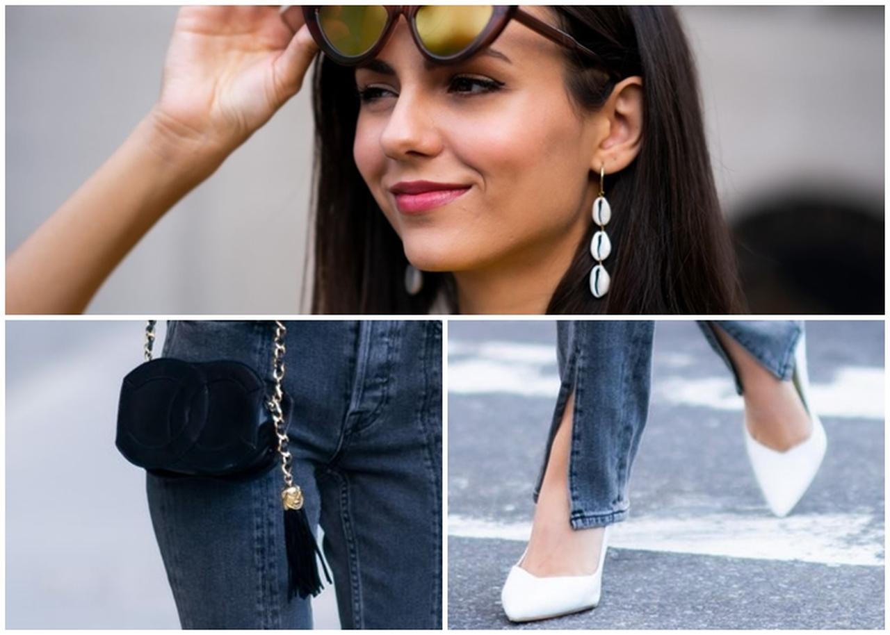 小物にもこだわるヴィクトリアは、顔回りをシェルのピアスで夏らしく飾り、Chanelのヴィンテージショルダーバッグを肩掛け。足元には旬なVカットのパンプスを合わせれば、「スプリットレグ・デニム」の逆Vラインとグッドバランスに。