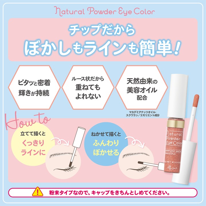 ソフトタッチの細チップは肌あたりがやさしくてポイント使いしやすく、オイルコーティングしたパールとカラーが目もとに密着し、輝きのある仕上がりが持続。また、乾燥しがちな目もとをケアする天然由来美容オイル成分配合。