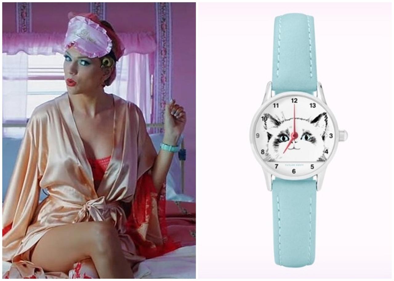テイラーの腕には、ミントグリーンのベルトが可愛らしい雰囲気の時計がON! 大の猫好きで知られるテイラーらしく、猫の顔がキュートに描かれたキャットウォッチも公式グッズとして作られたもの。こちらは約3,500円で販売中。