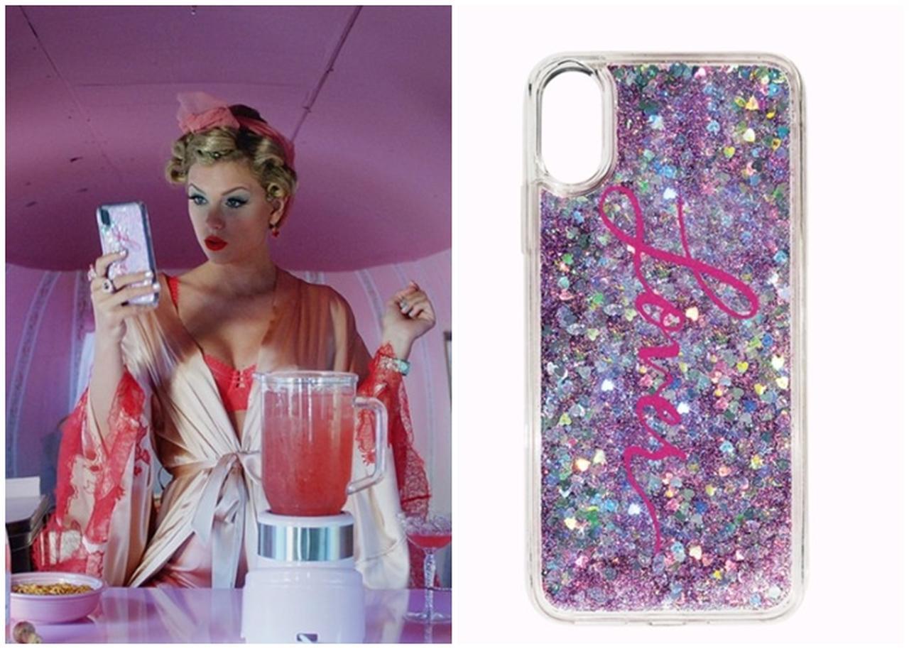 ピンク系のグリッターがふんだんにデザインされたスマホケースは、8月23日にリリースする最新アルバム『ラヴァ―(Lover)』のタイトルがプリントされたもので約2,500円。