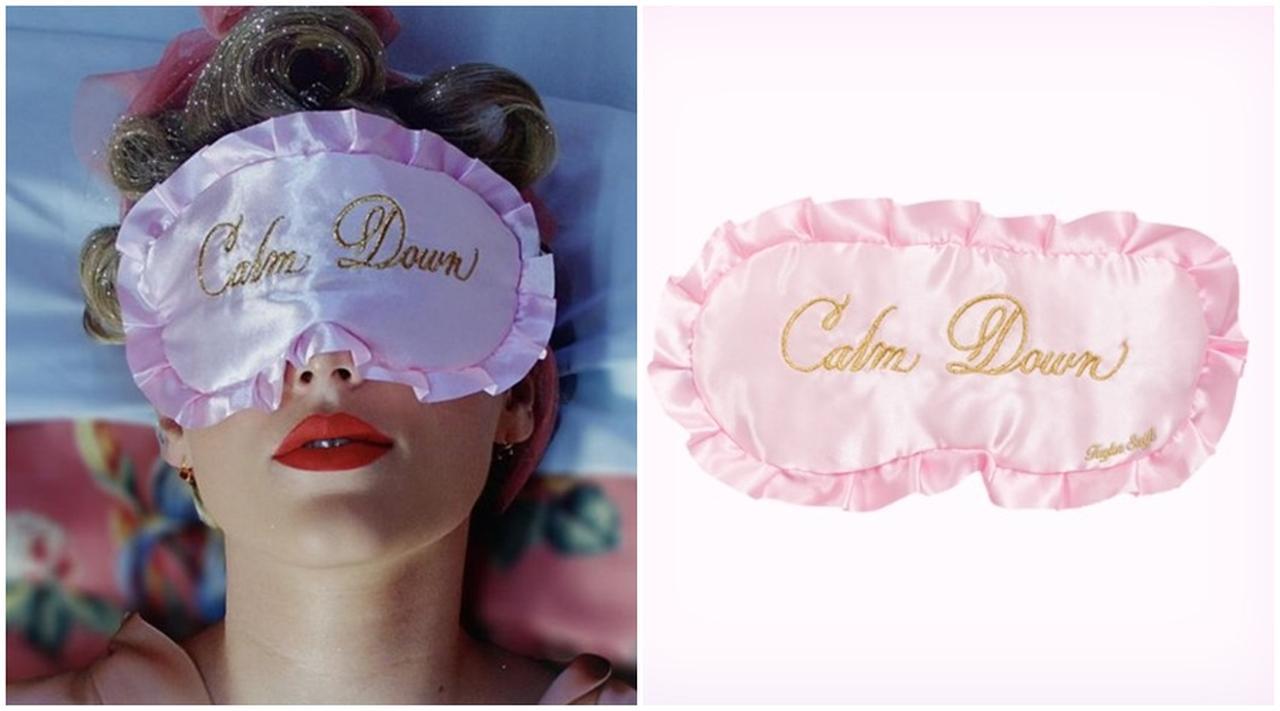 オープニングに登場するフリルがロマンティックなピンクのアイマスクは、テイラーの公式グッズ。「Calm Down」と刺しゅうされたフェミニンなアイテムは、曲名ともリンクしたキーアイテム! お値段は約2,000円。