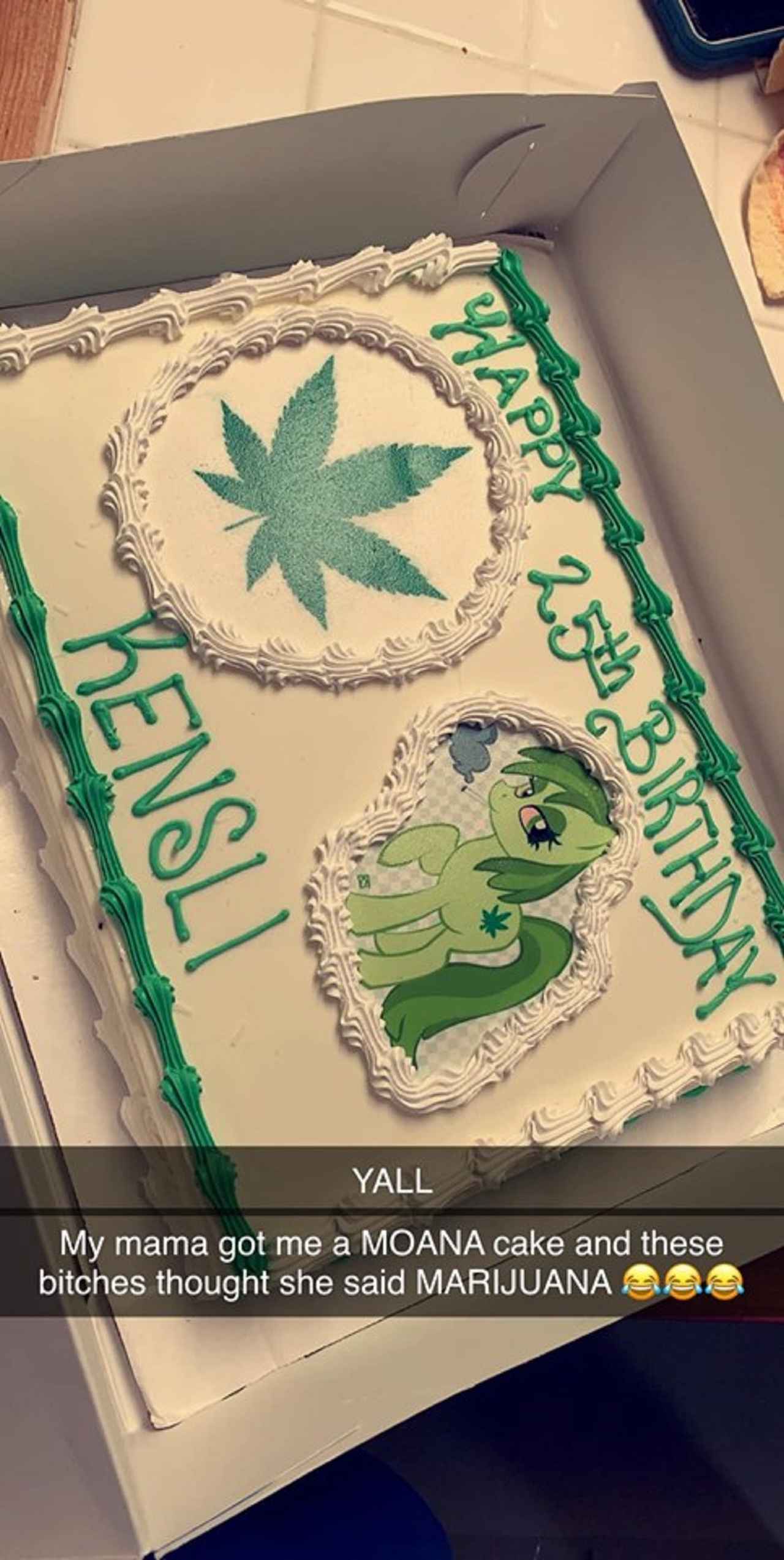 こちらがケンズリーが「ママは“モアナのケーキ”を注文してくれたのに、“マリファナのケーキ”と勘違いされちゃったみたい」というコメントに爆笑の絵文字を添えて公開したのが問題のとんでもないケーキの実物像。