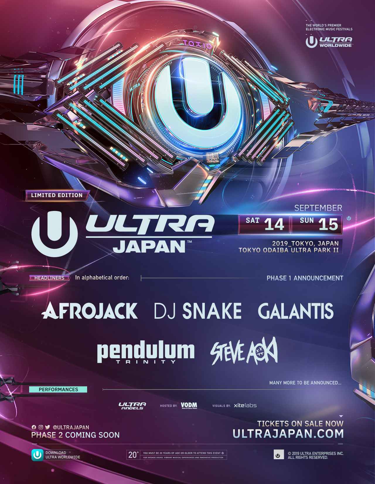 2019年のULTRA JAPANを盛り上げるファーストラインナップとして発表されたのは、セレーナ・ゴメスやカーディ・Bとコラボした「タキ・タキ」などの人気曲で世界中のフェスを席捲し続けているDJスネイクをはじめ、EDM界のアイコン的存在として不動の地位を確立しているアフロジャック、パフォーマンス中にケーキを投げることで有名なスティーヴ・アオキ、日本でも絶大な人気を誇るエレクトロデュオのギャランティス、そして世界が注目するペンデュラム・トリニティの5組。