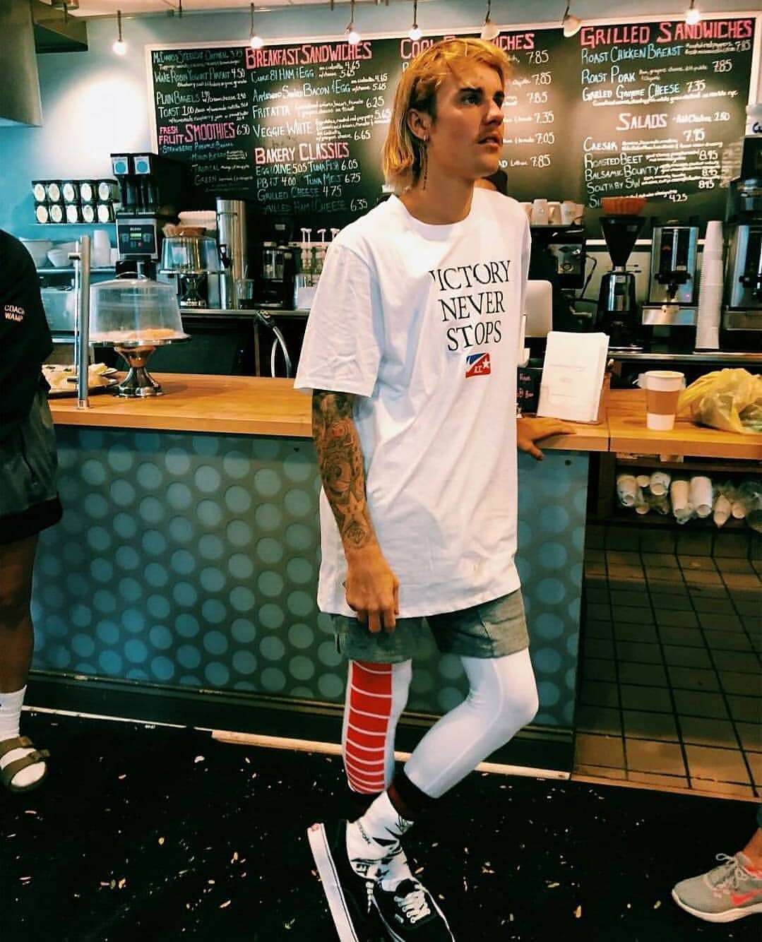 世界的シンガーのジャスティン・ビーバーは、Tシャツにショートパンツのスポーティーなルックに、タイツとソックスをレイヤードした旬なアスレジャースタイル。足元にはヴァンズのスニーカーをセット。