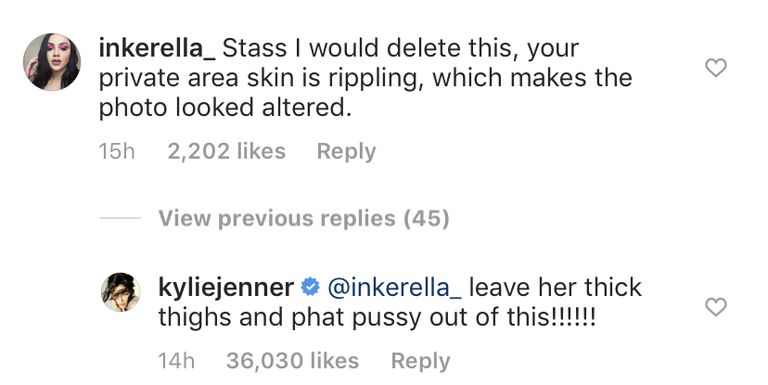 このアナスタシアの写真にカイリーは「外見も内面も美しいね」と満足気にコメントしていたのだが、アナスタシアの股間に注目したあるフォロワーからはこんな難癖が。