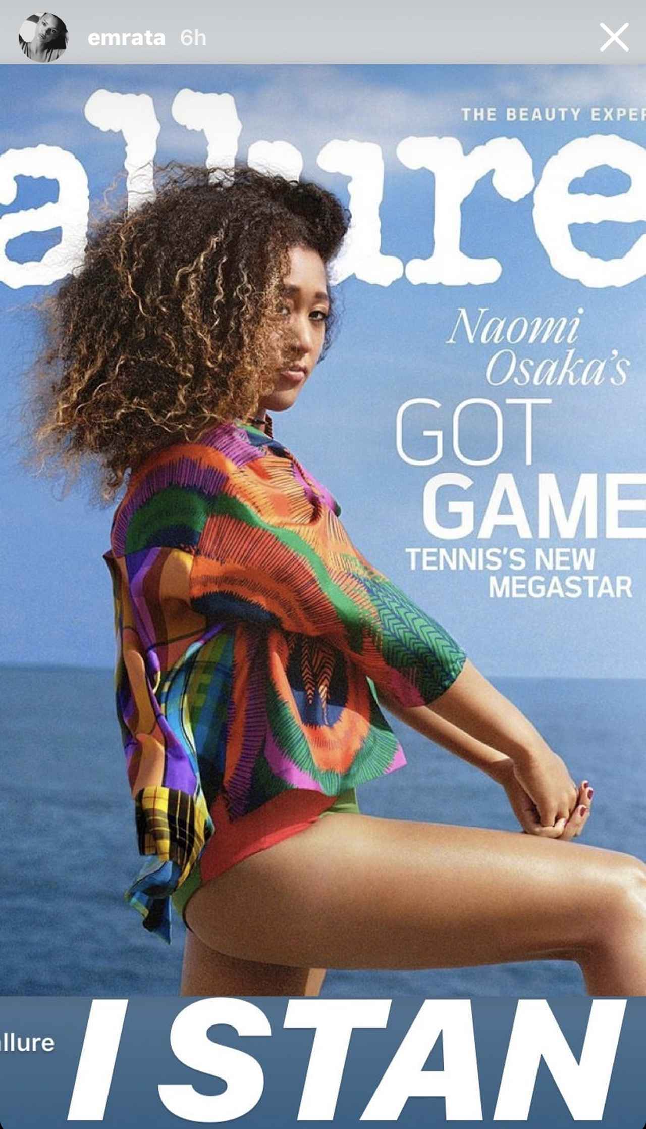 大坂なおみが表紙を飾った米Allureの8月号の画像を公開したエミリーは、「I STAN(アイ・スタン)」とコメントを添えて、“ストーカー級に大ファン”だということを公言した。