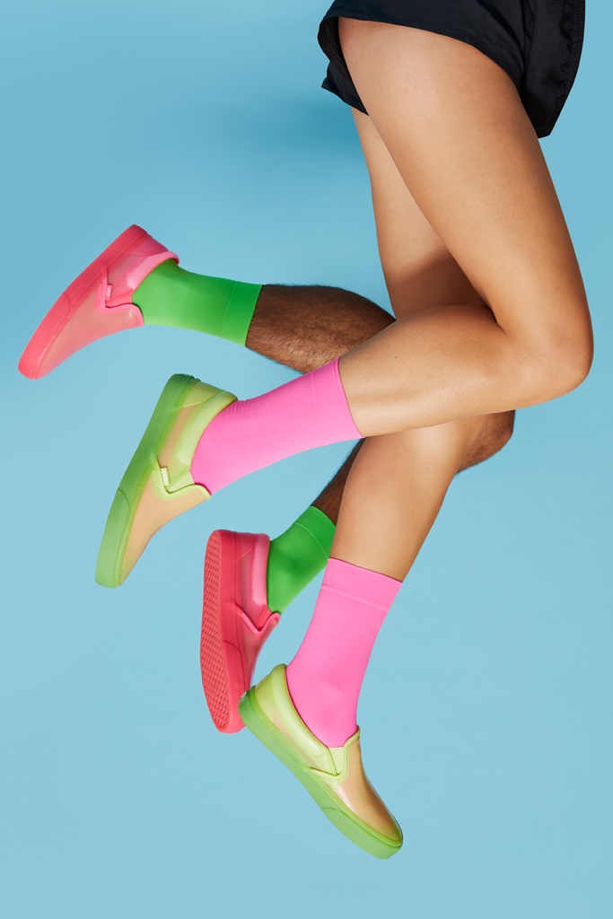 ネオングリーン、ホットピンク、ホワイト、そしてブラックの4色で展開されるコラボスニーカーは、カラフルなソックスと合わせて絶妙なスケ具合を楽しんで。