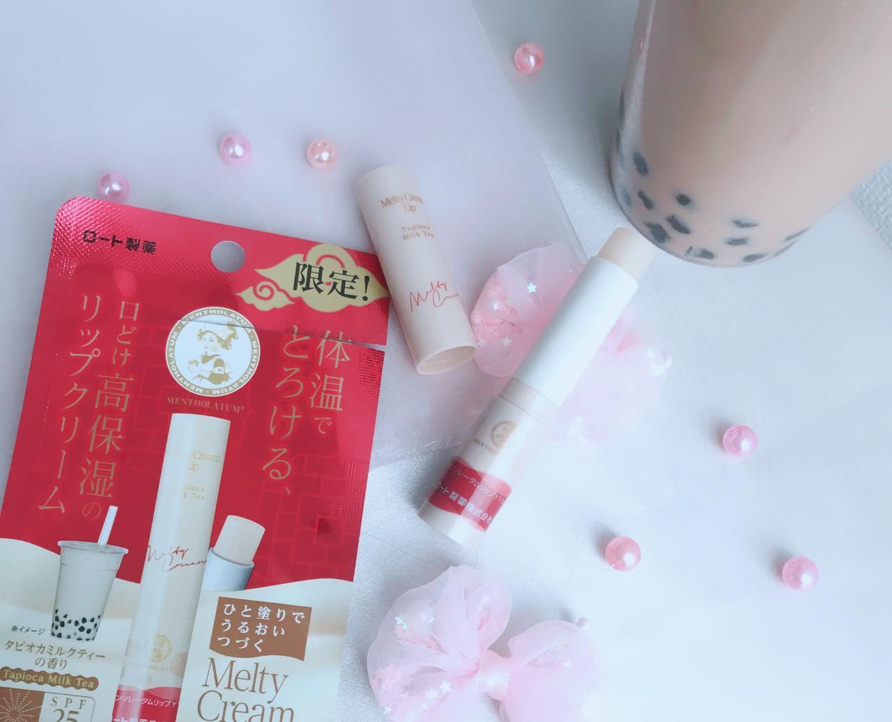 「メンソレータム メルティクリームリップ タピオカミルクティー」は、タピオカの甘さと茶葉のふんわりと濃い香りを表現。ミルクティ色をしているけれど、唇に色はつかない。