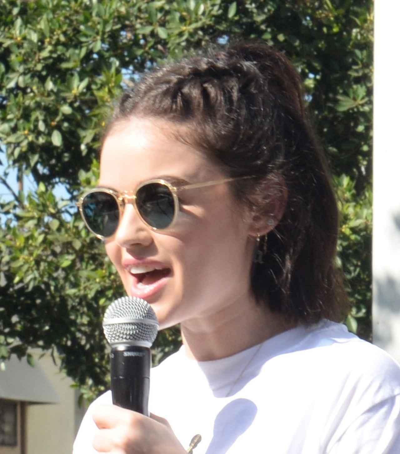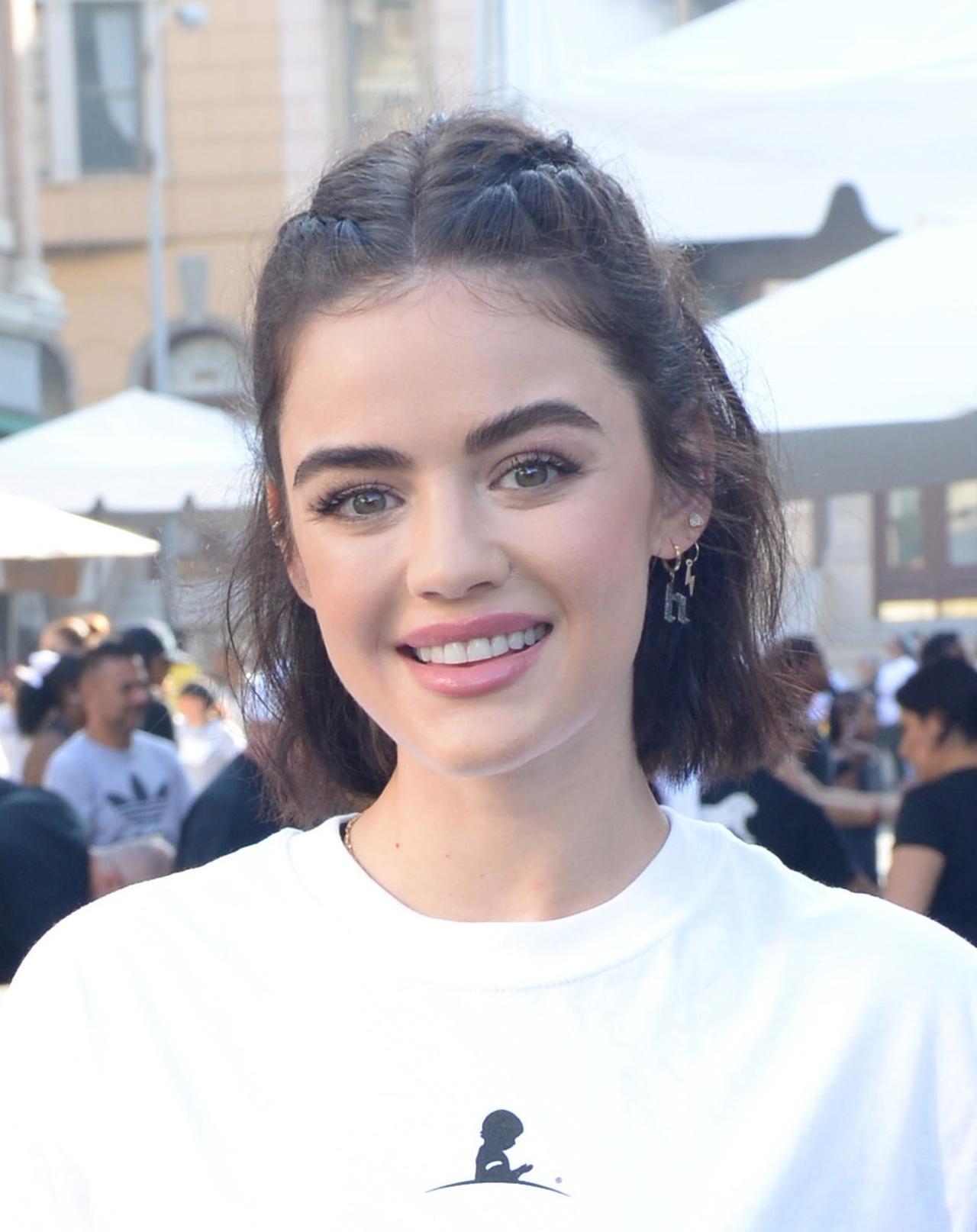 女優のルーシー・ヘイルは、フロントのヘアをセンターパートにして、ねじり上げるように編み込んだヘアアレンジ。