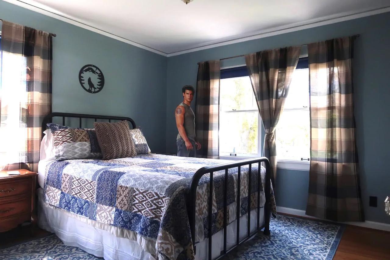 シリーズを通してスクリーンに映ることが多かったベラのベッドルームのほか、別のベッドルームには、おそらく貸出者はチーム・ジェイコブ(※)なのだろう、ジェイコブの等身大ボードが飾られている。