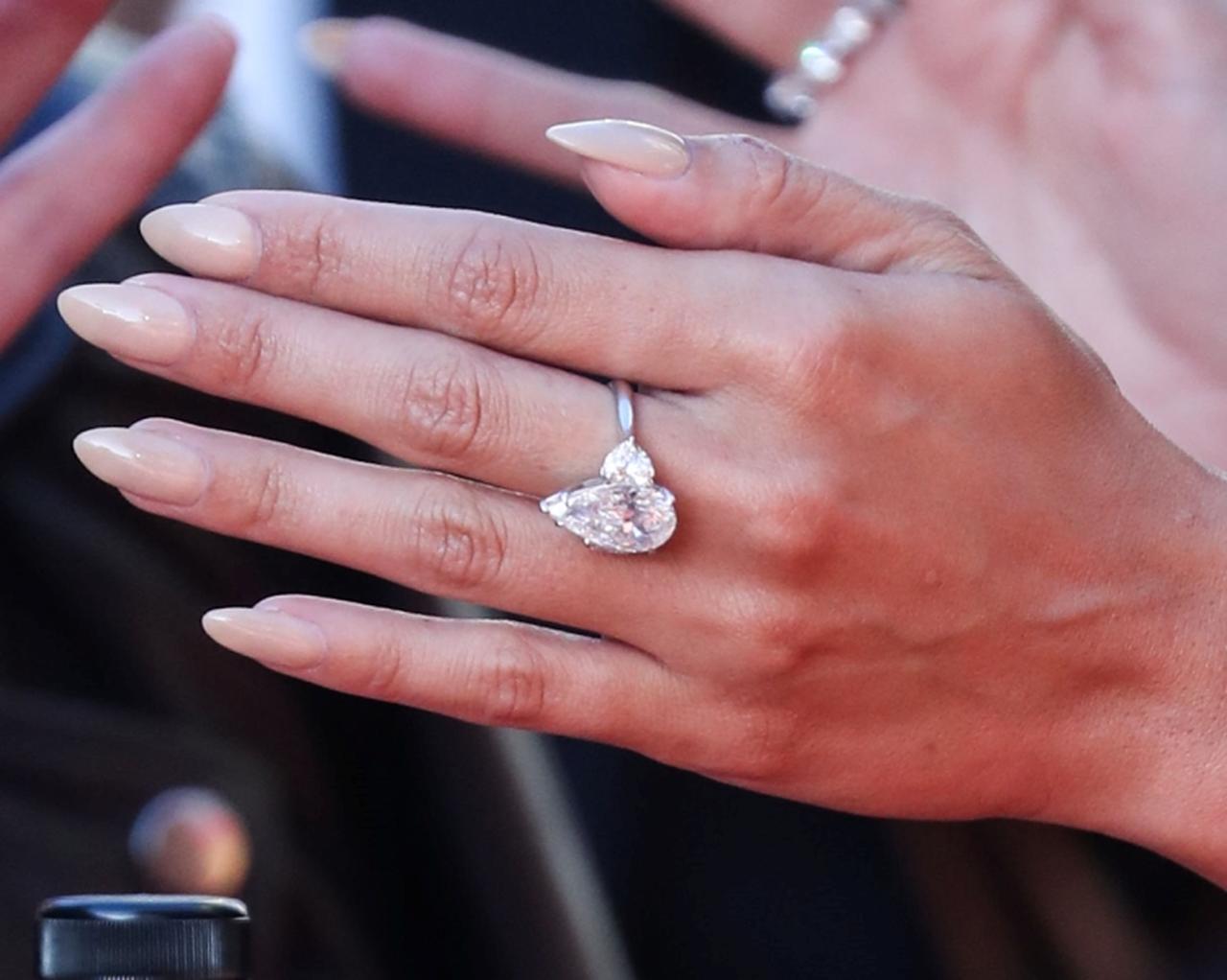 ウエストにポケットがついたユニークなデザインだったこともあり、ヴァネッサは、ほぼ、両手もしくは片手をポケットに入れたポーズでレッドカーペットでの写真撮影に臨んでいたのだが、ふとした瞬間にお目見えした彼女の左手には、ティアドロップ型の巨大ダイヤと丸型のダイヤが並んだ華やかな指輪が。