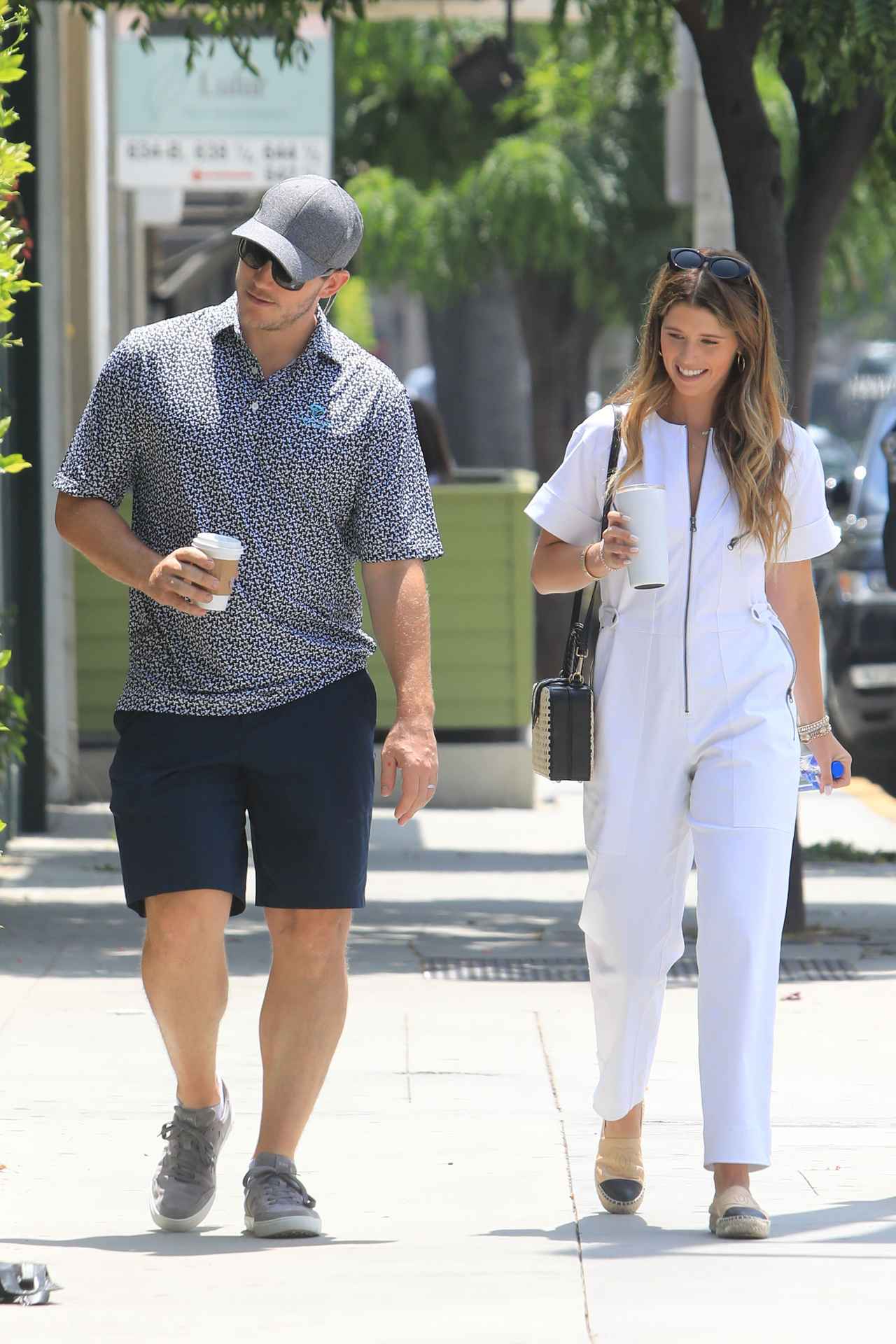 コーヒーを片手にスパへと向かう道を並んで歩く、新婚ホヤホヤのクリス&キャサリン。