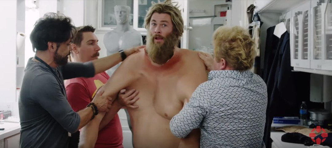 この激変した姿には、戦うことを諦めた姿がより人間らしいことから、神様のソーが、仲間や友人、同志という意味を持つブラザーのような存在に近づいたという意味で親しみを込めて「ブロ・ソー(Bro Thor)」という愛称がつけられたが、クリスがこのブロ・ソーになるまでの過程を収めた貴重な舞台裏映像が公開された。