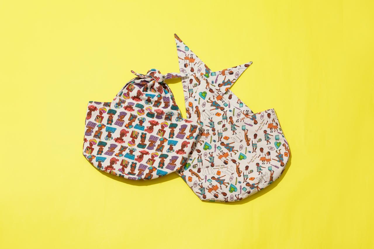 “毎日を笑って逞しく生きる、エネルギッシュな人々”を描いたアフリカ生地の布袋とガーナで手作りされたカゴバッグのセットアイテム。アフリカ生地を使用した布袋は単体で使用することも可能。結び目を自由自在にアレンジでき、カゴバッグから布袋を出してみたりと好みによって使い分けできるアイテム。