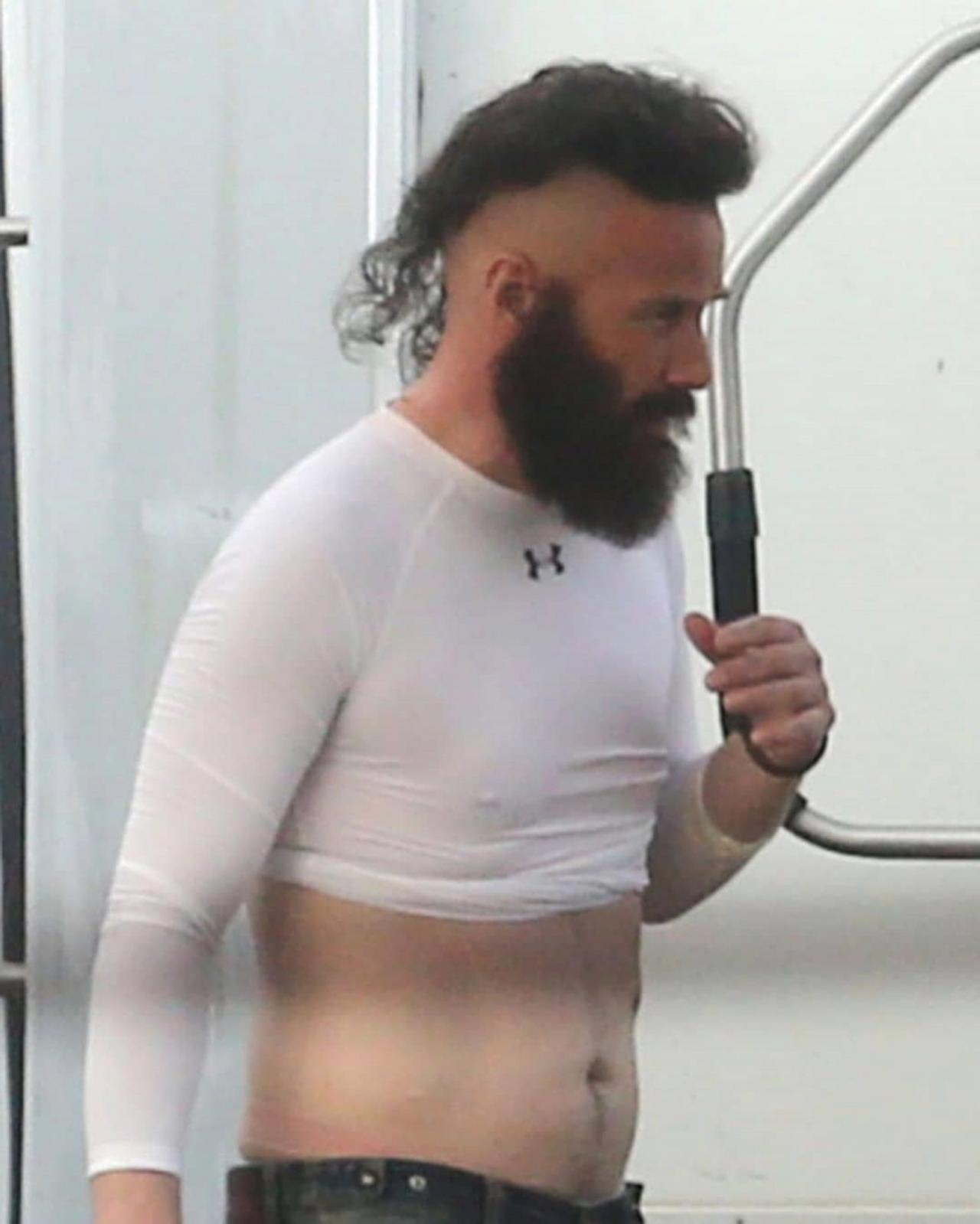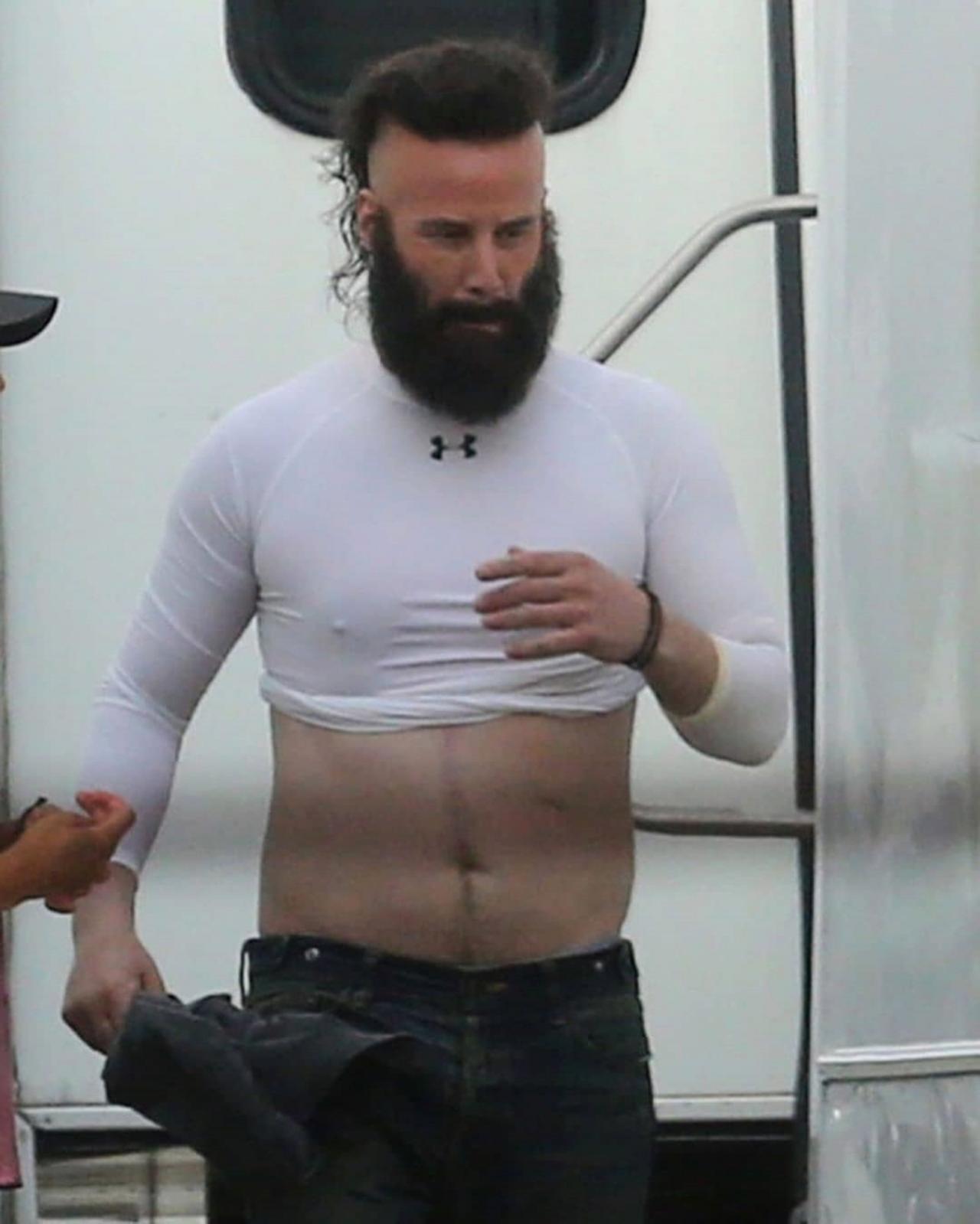 まるでゲーム『ストリートファイター』シリーズに登場するキャラクター、ザンギエフのようなルックスに変身し、しかも、乳首が透けるUnder Armour(アンダー・アーマー)の白いトップスをたくし上げてヘソ出しルックにアレンジするという不思議な格好に…。